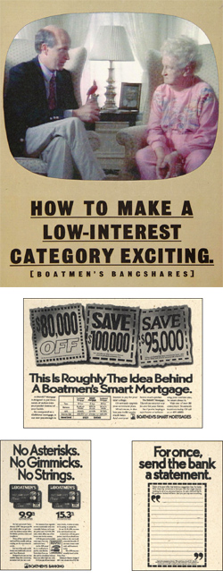 Feature "Boatmen's Guy" spokesman played by actor Thom Sharp in broadcast advertising supported by more detailed product-oriented print advertising. High visibility media sponsorships and sports tie-ins. Campaign helped bank grow from $5 billion to over $40 billion in assets. NationsBank announced acquisition plans on August 30, 1996.